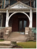 All foundation work is complete, including reapplication of original brick to the house’s front façade, installation of original limestone window sills and the rebuilding of the house’s original limestone front porch and steps. Front porch frame, floorboards and ceiling are yet to be installed. The original basement windows will be restored/rebuilt and installed. Original limestone front walkway has been temporarily set. A footing has been poured for the front walkway steps. We’re contemplating having the Grove St. city sidewalk replaced and a driveway approach poured.