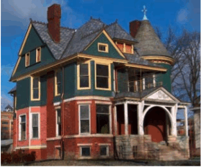 what was on the house originally. We looked at protected areas of the house and bottom layers of paint while scraping to determine the original color palette and then selected the closest matches to period paint colors, using historical paint reference books as guides. Our focus will be on priming any remaining new wood and getting a top coat paint on the 3rd story east side and back of the house, as weather permits.