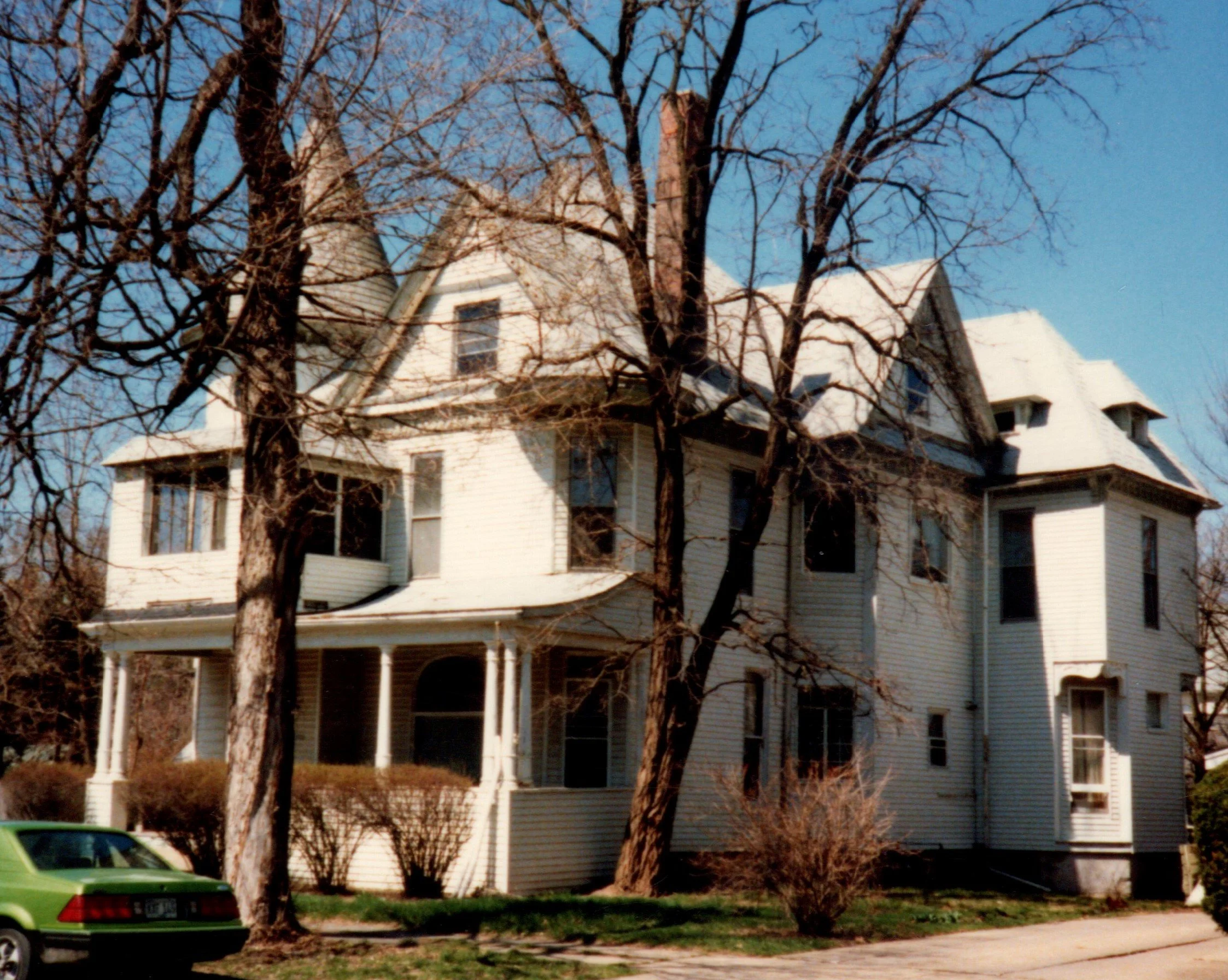 The Augustus Elbe House is a large 2-story frame structure designed in the Queen Anne Style. It was nominated for National Register prominence in 1986. It has a three-bay primary façade. The structure is dominated by a large rounded tower with a conical roof. Notable features: front doors, porch columns, eave and facia detailing and gable barge boards and panels.